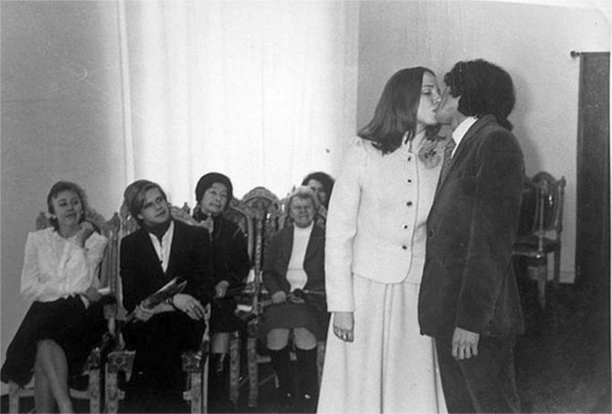 На регистрации были самые близкие. Позже «подтянулся» продюсер «Кино» Борис Гребенщиков, прихватив с собой красное вино. В итоге маленькая, но веселая компания устроила прямо в загсе настоящий «рок-н-ролл», а на следующий день в их маленькой квартирке около ста друзей продолжили шумное празднование.